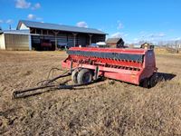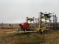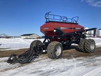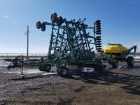 12 inch spacing, double shoot, JD 1910 air cart, 3 hi-flow, 2 low flow rollers, single row packers, 10 inch loading auger, single fan