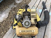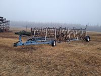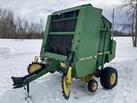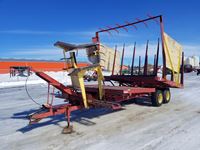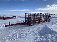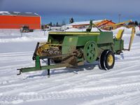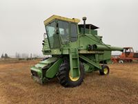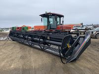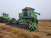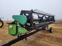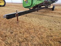 2004 MacDon 972 header, pick up reel, cab, air, heat, AC, poly pick up fingers, newer knives and guards, add on swath roller hitch, John Deere ATU wiring, 50% 21.5-16.1 12 ply drives, 60% 16.5-16.1 casters, 1541 engine hrs, 1275 header hrs