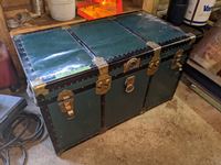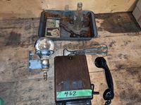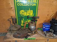 Part of lantern, gas iron, torch, brass pump, tabacco tin, binoculars, miscellaneous
