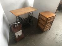 105 Magazine Stand, 3 Drawer End Table & Small table W/ old Singer Legs