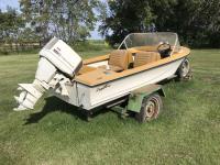 45 Chrysler outboard, fuel tank, oars, no jack, spare tire, hand winch, 14 ft tires (poor)