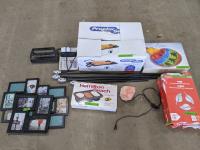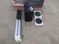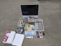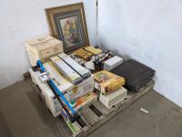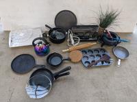 Hamilton roaster oven and serving pans, picture frame, curtain rods, salt lamp, printer paper, calculator, hole punch, serving dish
