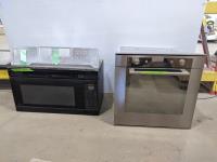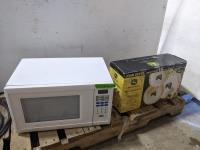 Microwave, cast iron dutch oven with lid, (40) jumbo sized markers and vintage coffee pot inserts