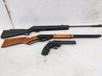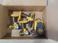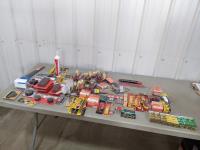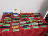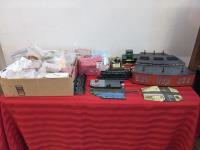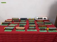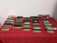 Caboose, box cars, pillar crane, steam engine and engine train cars