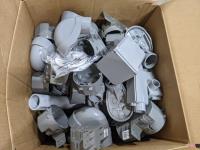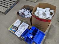 Pallet with organization bins, box of assorted plumbing, PVC connectors and plastic tap boxes
