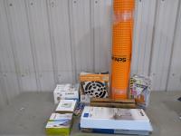 Shower and tub faucet, drain kit, sink faucet, cord protector, thermostat, air condition cord, 15 inch timber screws, ear plugs and roll of Schluter tile underlay