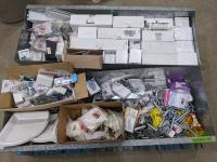 Pallet of miscellaneous, hardware, bolts, washers, anchors, and porcelain shower shelves