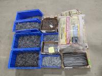 (2) Boxes of screw coils, exterior outlet covers, assortment of nails, anchors, hinges and harness rings