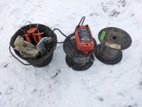 Red Snap'r 3mile range 110v electric fence controller, rubber bucket of Gallagher plastic gate handles, (2) partial rolls of aluminum wire
