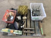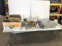 (14) post brackets, propane catalytic heater, (2) rollers, 240v plug and male cord, (2) Dandelion bars, spool of rope, assorted lights and deck beam bracket