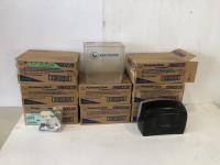 (8) jumbo tissue dispensers, ear plug dispenser, roll of tub trim, (2) drawer filing cabinet, night stand