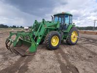 Allied 595 loader, Q/A, 84 inch bucket, grapple, mid mount hydraulic connection, John Deere 7.6 L 6 cylinder diesel engine, 110 PTO HP, 16 speed Quad Range partial power shift transmission, cab, rear differential lock, joystick, A/C, radio, 540/1000 PTO, 2 rear hydraulic outlets, rear wheel weights, 10.00-16 front tires, 16.4-38 rear tires