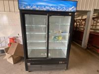 2 sliding doors, metal shelving, power switch, light switch, thermostat display.