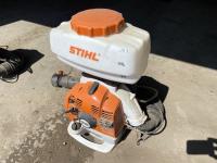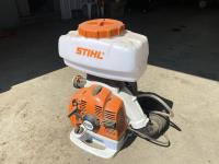 Gas powered, back straps, 14L poly tank, hand throttle.