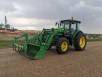 John Deere 280 loader, Q/A, 96 inch bucket, grapple, bale forks, mid mount hydraulic connection, John Deere 7.6 L 6 cylinder 157 HP, diesel engine, 140 PTO HP, 15 speed power shift transmission, cab, ROPS, joystick, A/C, radio, 540/1000 PTO, 3 point hitch, 2 rear hydraulic outlets, rear wheel weights, 16-9-26 front tires, 20.8-38 rear tires