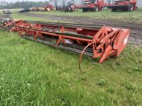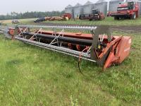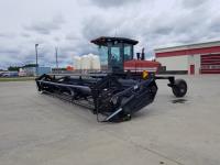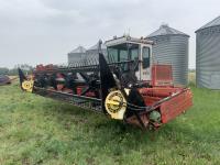 MacDon 960 25 ft center delivery rigid draper header, pickup reel, double knife drive, 4 cylinder diesel engine, A/C, radio, 16.5L-16.1SL front tires, 21.5L-16.1 rear tires