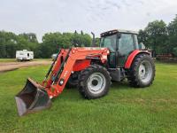 Massey Ferguson 955 loader, Q/A, 82 inch bucket, mid mount hydraulic connection, Perkins 6.6 L 6 cylinder 135 HP, diesel engine, 110 PTO HP, 16 speed Quad Range partial power shift transmission, cab, ROPS, left hand reverser, rear differential lock, joystick, A/C, radio, air ride seat, buddy seat, 540/1000 PTO, 3 point hitch, 3 rear hydraulic outlets, 420/70R28 front tires, 520/70R38 rear tires