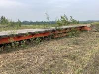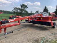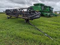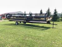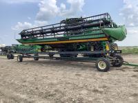 pickup reels, fore & aft, Teflon bottom wear plate,12 inch upper cross auger, all canvas and knife and guards in good condition, header has been checked over and is in good overall condition. Mandako tandem header transport c/w light package in excellent shape