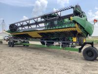 pickup reels, fore & aft, teflon bottom wear plates, gauge wheels, good canvas, knife and guards all good, mounted on a Harsh CFCH header transport c/w light package
