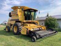 variable speed reel, fore & aft, reverser, lateral tilt, rock trap, chaff spreader, fine cut chopper, premium lighting, grain loss monitor, A/C, buddy seat, New Holland 6 cylinder 7.5L engine, rear adjustable axle, pickup header with Swathmaster pickup, new tarp for Maurer hopper extension, 30.5-32 front tires