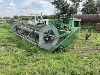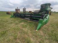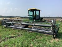 John Deere 25 ft rigid draper header, pickup reel, gauge wheels, John Deere 4 cylinder diesel engine, Cab, rear weights, 13.6-24 front tires