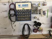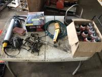 (9) cans of cleaning wax and auto restore, inspection lamp, (8) metal clamps, Air Hawk cordless tire inflator, miscellaneous hardware
