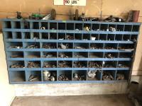 Vintage pulley, grease gun, (3) small bolt cabinets with miscellaneous hardware, welding helmet, poly tool box