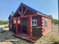 Unfinished inside, tin roof, on treated 6 inch x 6 inch skids, SICO log and siding stain on exterior. Built August 2023.