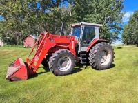 Massey 848 loader, Q/A, bucket, 60 inch bale forks, Perkins 1006-6T7 6 L 6 cylinder diesel engine, 115 PTO HP, 32 speed Dyna Shift partial power shift transmission, cab, left hand reverser, joystick, A/C, radio, upgraded stereo, 540/1000 PTO, 3 point hitch, 2 rear hydraulic outlets, 16.9R28 front tires, 20.8R38 rear tires