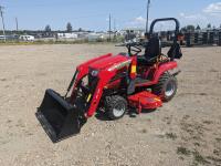 Massey Ferguson FL1805 loader, Q/A, 48 inch bucket, 42 inch pallet forks, Iseki 1.1 L 3 cylinder 22.5 HP, diesel engine, 18.7 PTO HP, hydro 2 range transmission, ROPS, joystick, 60" belly mount mower deck, 540 PTO, 3 point hitch, 18X8.50-10 front tires, 26X12.00-12 rear tires