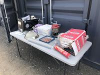 Welding helmet, safety mask, battery, wire, screws, heat tape, chainsaw chain & sharpener.