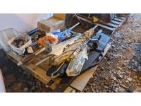 Qty of slow moving signs, (2) slings, (2) tow guard mud flaps, metal detector, Hi viz vests, trouble light