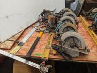 (5) Makita corded 210 mm circular saws, level, axe, B&D router, Porter Cable belt sander, Canwood 1/4 inch plunge router, 48 inch drywall square
