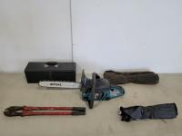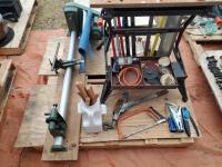 5 Speed 37 inch Wood Lathe, 120 Volt Up to 37 inch Spindle Turning & 12 inch Inboard Bowel Complete with 7 pieces/Set Wood Lathe Chisel, Assorted end Wrenches, Black & Decker 3/8 inch Variable Speed Reversing Drill with Sanding Disk Attachments, Small Portable Buck Saw, Come along, Wire Stripeasy, Black & Decker Woodmate Plus Portable Vise Work Table, Snow Shovel
