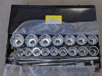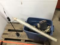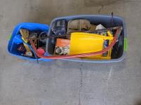 Large Ammunition Box, B&D 1/2 inch Impact & 3/8 inch B&D Drill, 3 Ton Jack Stand, LED 15 ft Drop Light, Impact Socket Set, 1/4 inch Ratchet Socket Set, Small Tool Set, Caulking Gun, shovel, truck rail<br/>