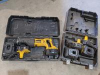 Dewalt 18 Volt Variable Speed Reciprocating Saw, Dewalt AM/ FM Stereo & Battery Charger, Dragon 18 Volt 2 Speed Cordless (New in box) Hammer Drill, Two 18 Volt Batteries, Charger & Handle<br/>