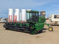 John Deere 21 ft double delivery rigid draper header, pickup reel, John Deere 4 cylinder diesel engine, A/C, radio, 18.4-16.1 front tires, 8.5L-14 rear tires