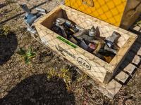 Black & Decker long reach cordless tree pruner, (2) watering cans, oil can, T square, 8 lb sledge hammer, hand saw, crow bar, Stanley tool box