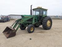 John Deere 158 loader, 72 inch bucket, John Deere 6.6 L 6 cylinder diesel engine, 120 PTO HP, 8 speed manual transmission, cab, 1000 PTO, 2 rear hydraulic outlets, rear wheel weights, 11.00-16 front tires, 20.8-38 rear tires