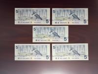 Set of five 1986 five dollar bills.