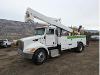 Cummins ISC250 8.3 L 6 cylinder 250 HP diesel engine, engine block heater, Eaton 9 speed manual transmission, A/C, cruise control, radio, CB radio, stereo, rear mount crane, Altec LM438 bucket system, spring suspension, 12,000 lb front axle, 21,000 lb rear axles, diff lock, 165 inch WB, 11R24.5 tires