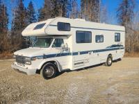 V8 gas engine, auto transmission, rear dual wheels, awning, fridge, stove, bathroom, above cab bed