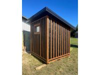 layer floor system - pressure treated skids, timber frame of 5x5 post and beam, 3x5 floor joists, 5/8 t+g plywood, sloped floor with floor drain, Kerdi board, duroc with a thin set cement mix, topped off with interlocking rubber matting, fully insulated floor, walls, and roof with foil vapour barrier, interior is all cedar, venting slots, screwed metal roof and trim, Harvia M3 Sauna heater