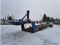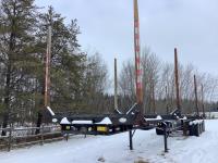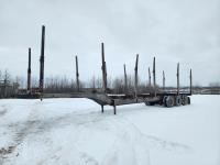 (6) 10 ft bunks, wide track axles, trailer is built to have a 4th lift axle, tri drive or tandem truck hook up, rear lift cable, log tie down winches with rope on each bunk, 2 sets of stakes are on the ground with hardware , air ride suspension, all aluminum wheels, 11R24.5 tires