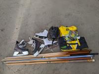 Pool cues, lifejacket, ice skates, helmet