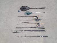 (2) nets, (3) rods with reels, (2) rods, (1) ice fishing rod
