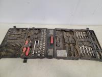 Face masks, 125 ft fish tape, (4) ladder platforms, 4 inch - 4-3/4 inch fire extinguisher holder, 3 inch polishing discs, exam gloves, (3) wire stripper/crimpers, screwdriver, 1-15/16 inch 1 inch drive socket, 27 piece letter stamp set