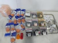 (23) boxes of Makita eye shields, qty of 6-1/2 inch diameter fan blades, qty of colored LED bulbs, aluminum lamp housing, 8 inch amber dome light covers