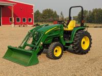 John Deere 400X loader, 73 inch bucket, mid mount hydraulic connection, John Deere 2.4 4 cylinder 58 HP, diesel engine, 50 PTO HP, hydro 3 range transmission, open station platform, joystick, Q/A 3 point hitch, 1 rear hydraulic outlets, 10-16.5 front tires, 17.5-24 rear tires