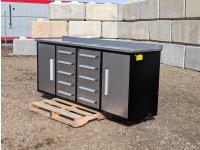 (2) metal boxes, display shelf 52 inch L X 10 inch D X 31 inch H, (2) tables (1) 25 inch X 19 inch X 20 inch high, (1) 26 inch X 22 inch X 20 inch high